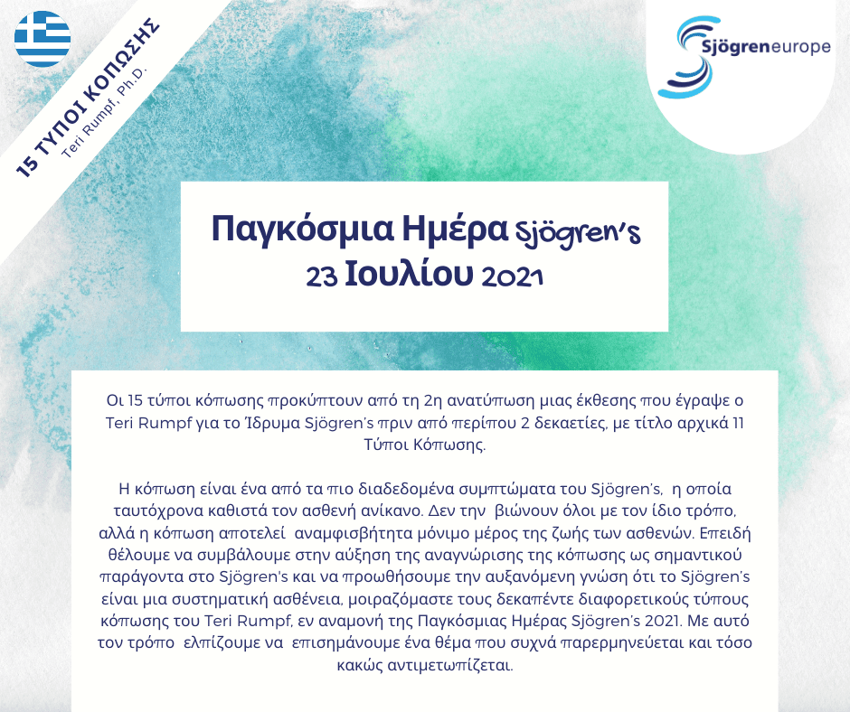 «Επειδή θέλουμε να συμβάλουμε στην αύξηση της ευαισθητοποίησης και της αναγνώρισης της κόπωσης ως σημαντικού παράγοντα στο Sjögren’s και να προωθήσουμε την αυξανόμενη γνώση ότι το Sjögren’s είναι μια συστημική ασθένεια, η SJÖGREN EUROPE και η ΕΛ.Ε.ΑΝ.Α. με αφορμή την Παγκόσμια Ημέρα Sjögren’s ανήρτησαν στα μέσα κοινωνικής δικτύωσης τους 15 τύπους της χρόνιας κόπωσης. Με αυτό, ελπίζουμε να παρουσιάσουμε ένα θέμα που συχνά παρερμηνεύεται και αντιμετωπίζεται τόσο άσχημα» ανέφερε η Alice Grosjean (Mrs), Πρόεδρος της SJÖGREN’S EUROPE, της οποίας ιδρυτικό μέλος είναι η ΕΛ.Ε.ΑΝ.Α.