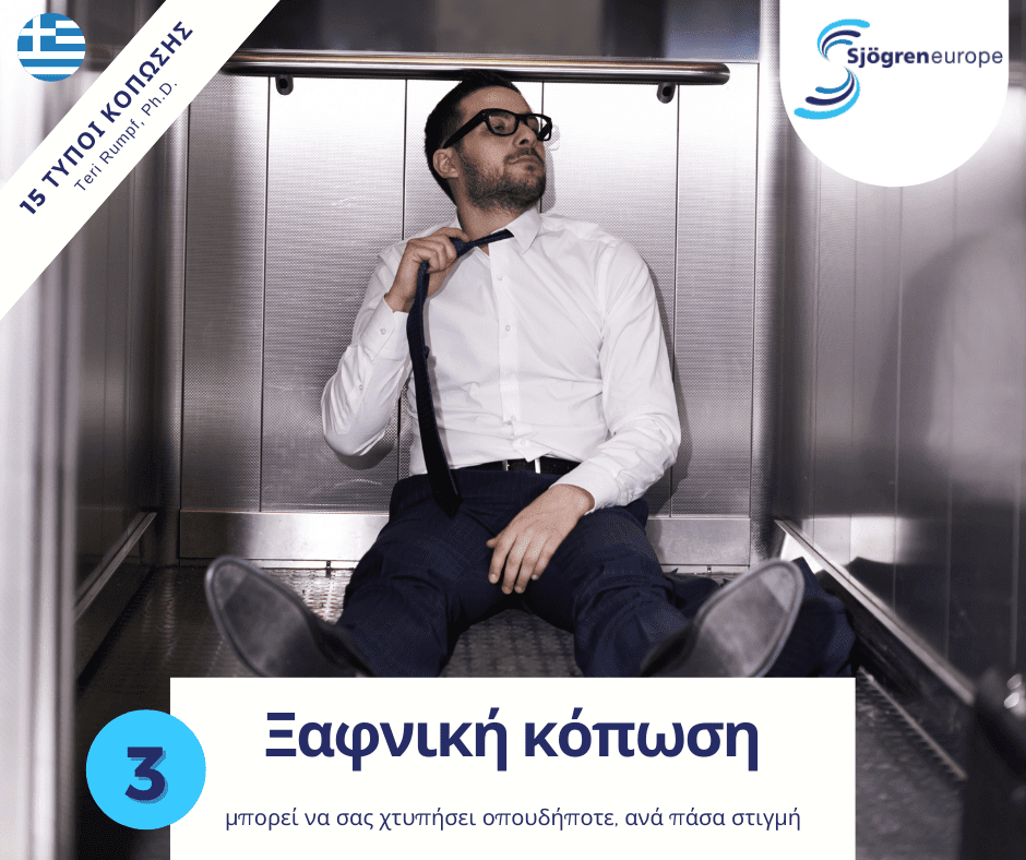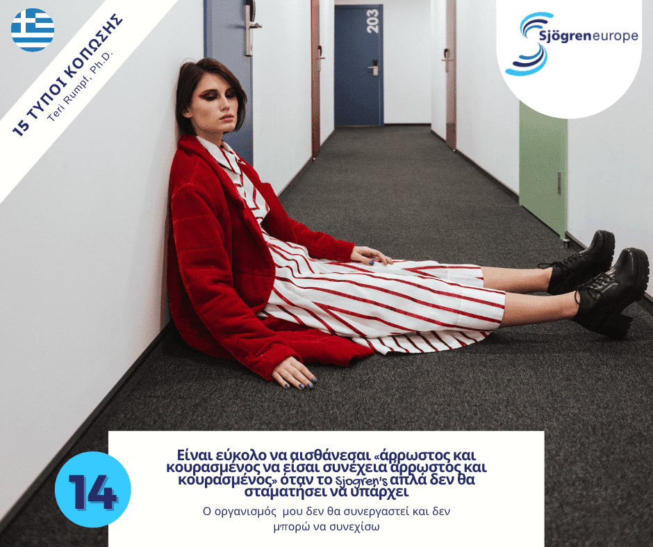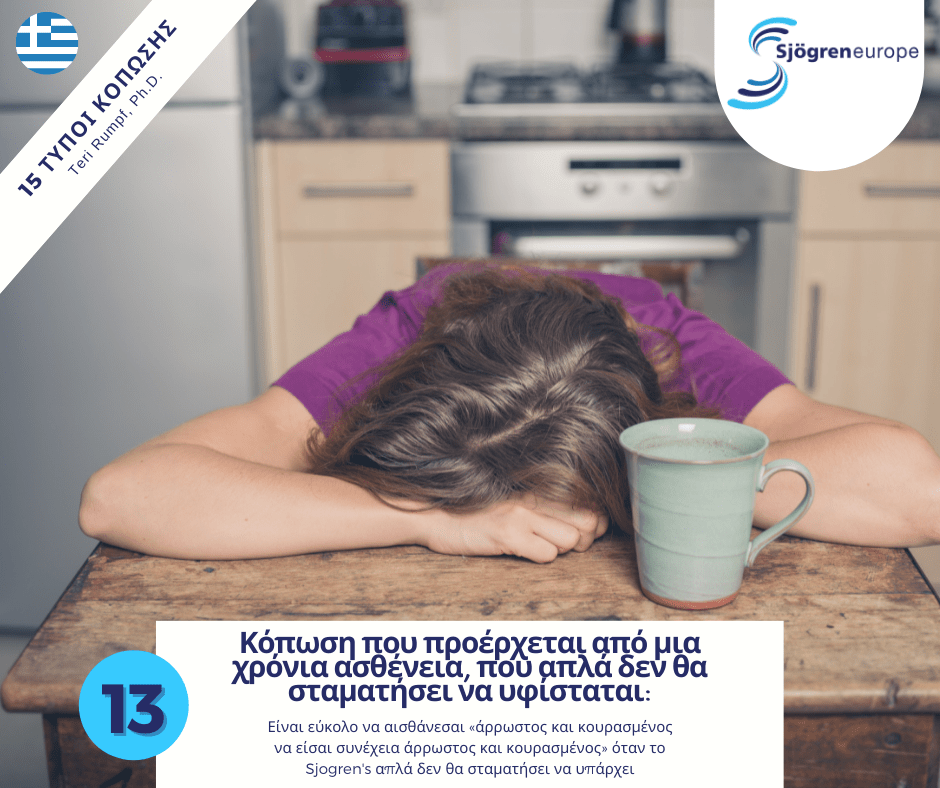 - Κόπωση που προέρχεται από μια χρόνια ασθένεια, που απλά δεν θα σταματήσει να υφίσταται: Είναι εύκολο να αισθάνεσαι «άρρωστος και κουρασμένος να είσαι συνέχεια άρρωστος και κουρασμένος» όταν το Sjogren’s απλά δεν θα σταματήσει να υπάρχει.