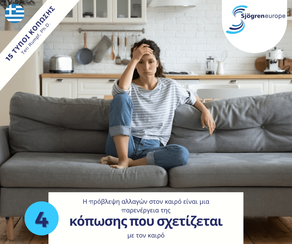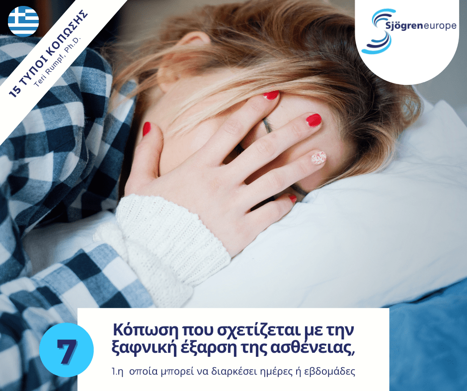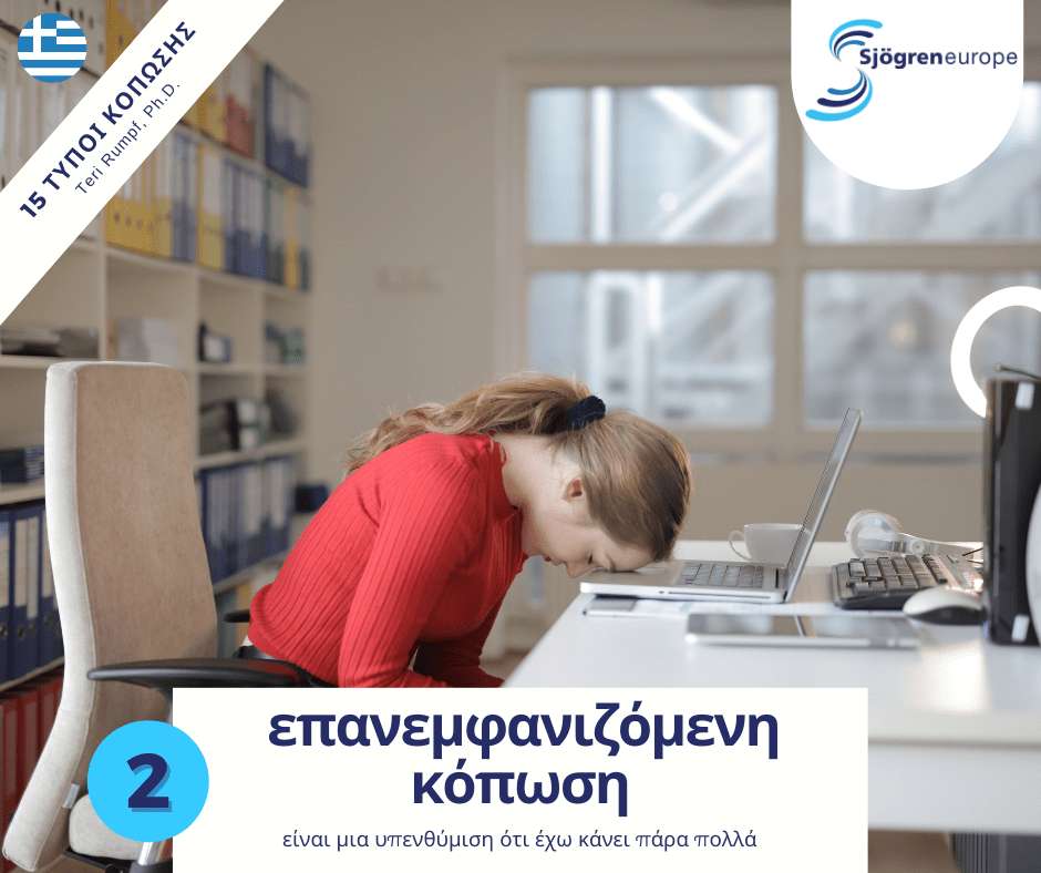Η χρόνια κόπωση είναι ένα από τα πιο διαδεδομένα συμπτώματα του Sjögren’s και διαφέρει σαφώς από τη συνηθισμένη κούραση σύμφωνα με την κα Καίτη Αντωνοπούλου, Ταμία της SJÖGREN EUROPE και της ΕΛ.Ε.ΑΝ.Α. Το περιγράφουμε ως μια αδιάκοπη, κυμαινόμενη και αναξιόπιστη έλλειψη ζωτικότητας που είναι πέρα από τον έλεγχο κάποιου. Δεν το βιώνουν όλοι με τον ίδιο τρόπο, αλλά η κόπωση είναι αναμφισβήτητα μόνιμο μέρος της ζωής των ασθενών. Είναι ένα εξουθενωτικό σύμπτωμα που σχετίζεται με μειωμένη ποιότητα ζωής, που σχετίζεται με την υγεία» κατέληξε η κα Αντωνοπούλου.