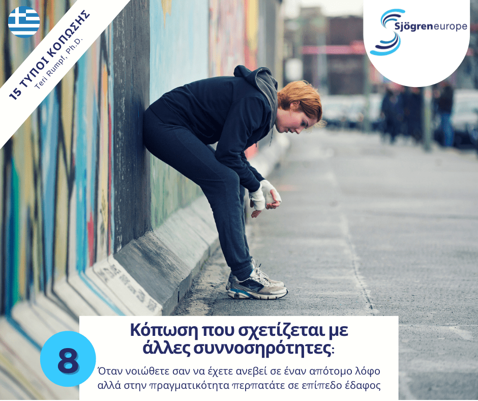 - Κόπωση που σχετίζεται με άλλες συννοσηρότητες: Όταν νοιώθει ο ασθενής σαν να έχει ανεβεί σε έναν απότομο λόφο αλλά στην πραγματικότητα περπατά σε επίπεδο έδαφος.