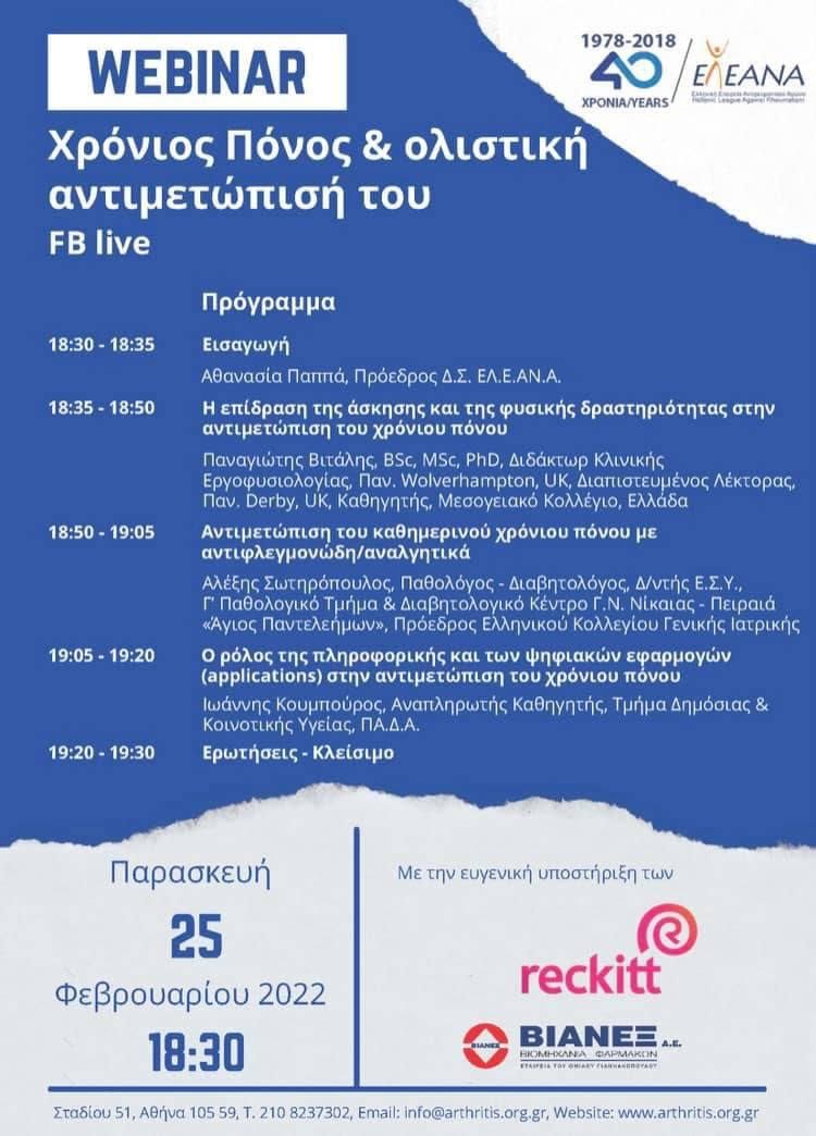 Παρακολουθήστε διαδικτυακά την Παρασκευή 25 Φεβρουαρίου 2022 και ώρα 18:30 το webinar της ELEANA, με θέμα τον χρόνιο πόνο και την ολιστική αντιμετώπισή του, στο Facebook: https://www.facebook.com/eleanarheumatism